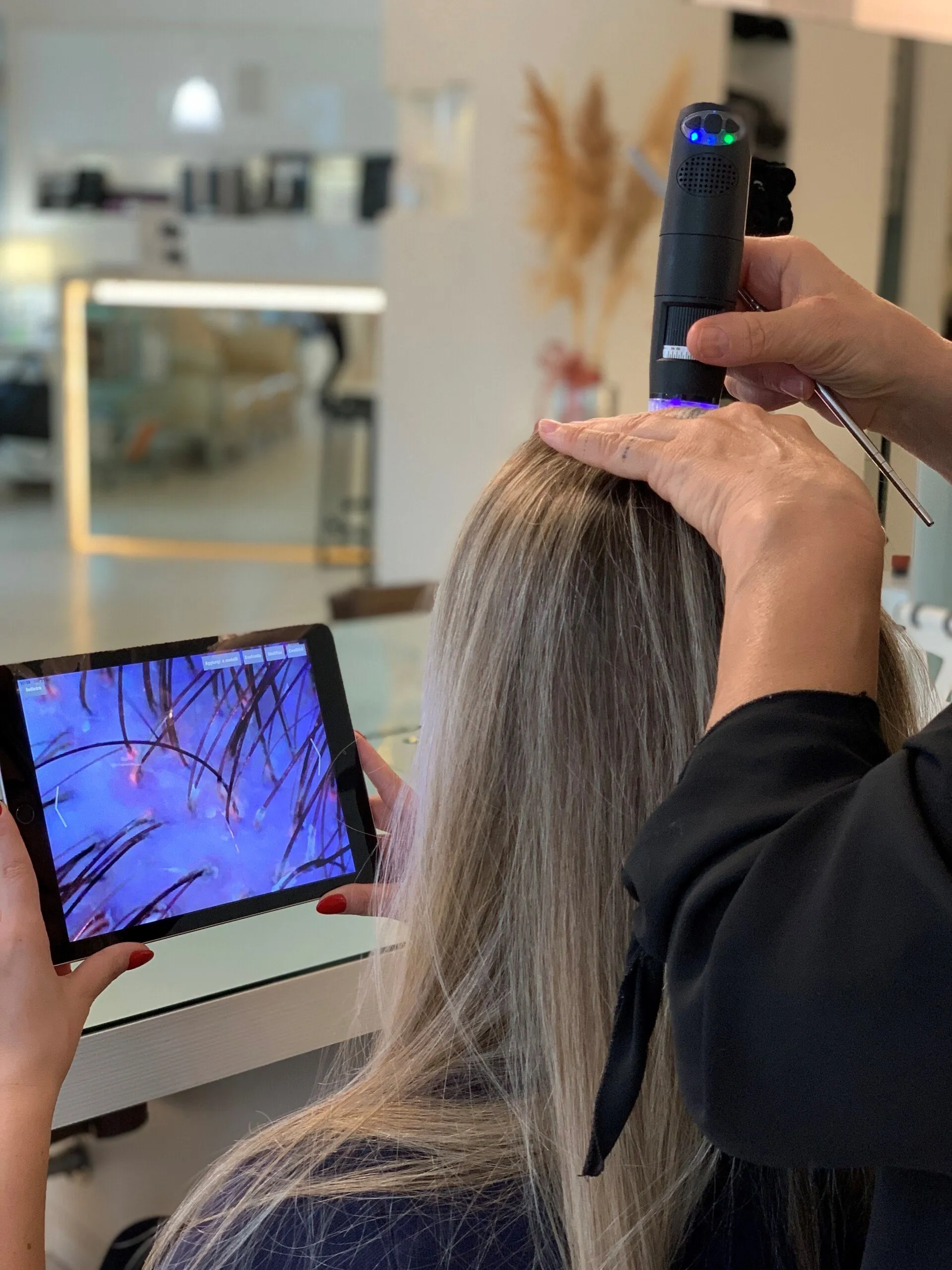 Ogni percorso inizia con un check-in test tricologico approfondito, che comprende l’analisi del cuoio capelluto e del capello. Utilizziamo la microcamera professionale, uno strumento ad alta definizione che ci consente di osservare in tempo reale la salute della cute e della fibra capillare.